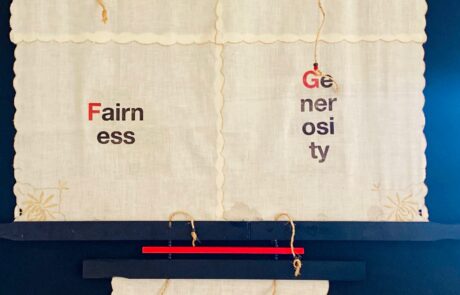 Motilal Jattan’s art series, “Cloth of Words,” is a powerful exploration of the personal attributes essential for thriving as a Black man in modern America. Each piece in the collection is meticulously crafted using fabric, hemp, ink, wood, and yarn, creating a tactile narrative that resonates with resilience, strength, and wisdom. The series weaves together words and symbols embroidered or painted onto fabric, each representing qualities like perseverance, dignity, courage, and unity. Hemp threads and yarn are interlaced with the fabric, symbolizing the interconnectedness of these attributes, while wooden frames add a grounding element, reflecting the solid foundation needed to navigate life’s challenges. The ink, sometimes bold and sometimes faint, mirrors the varying intensity of the struggles and triumphs faced daily. “Cloth of Words” not only serves as a tribute to the Black man’s enduring spirit but also as a visual manifesto for empowerment in the face of adversity.